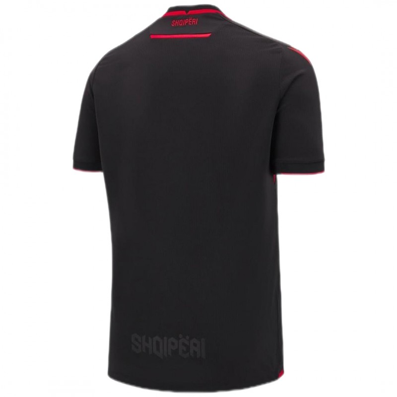 The Albania 24-25 third shirt has the same design as the home and away shirts, but is predominantly black with red logos.