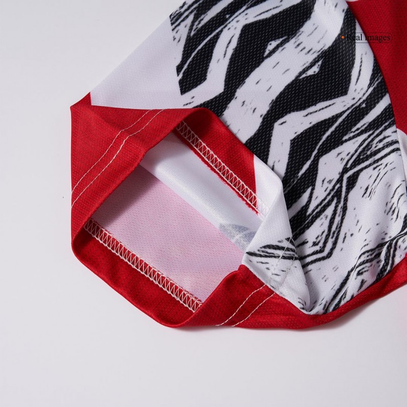 Arsenal 2025 pre-match football shirt features the red base of the home kit, the unique black and white pattern seen on the away and pre-match shirts, plus the lilac and turquoise blue of the third kit.