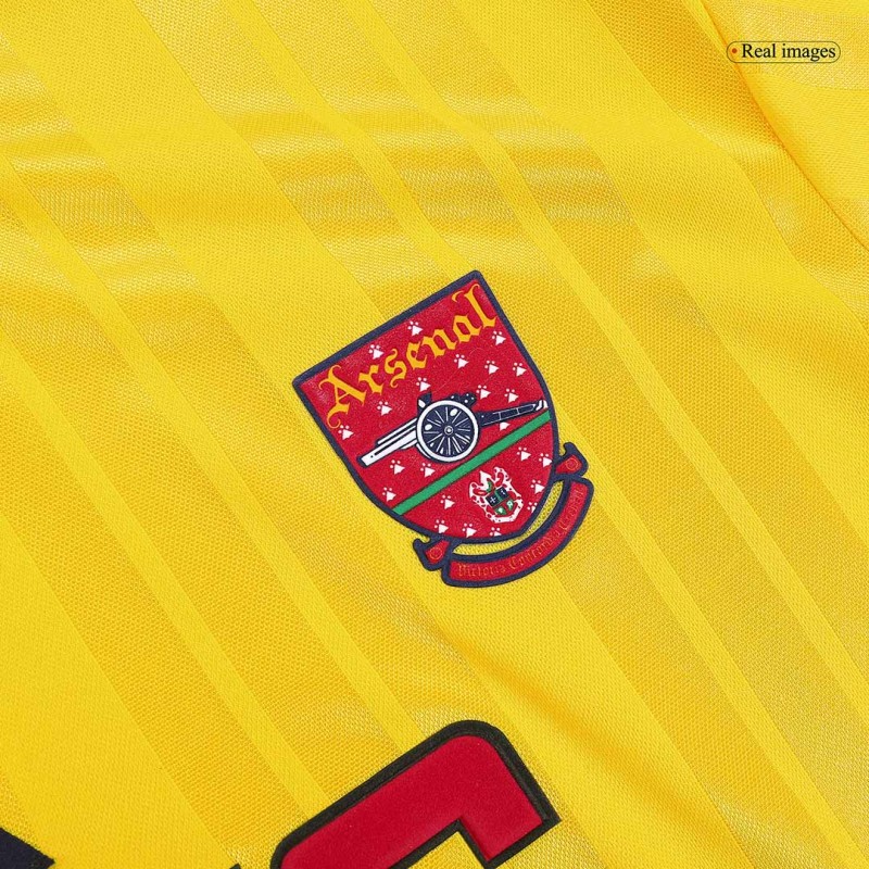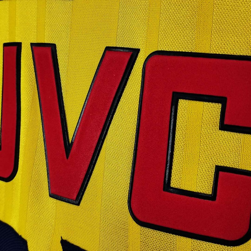 The collar and sleeve cuffs of the Arsenal 94-94 remake jersey feature red and dark blue in addition to the yellow base color.