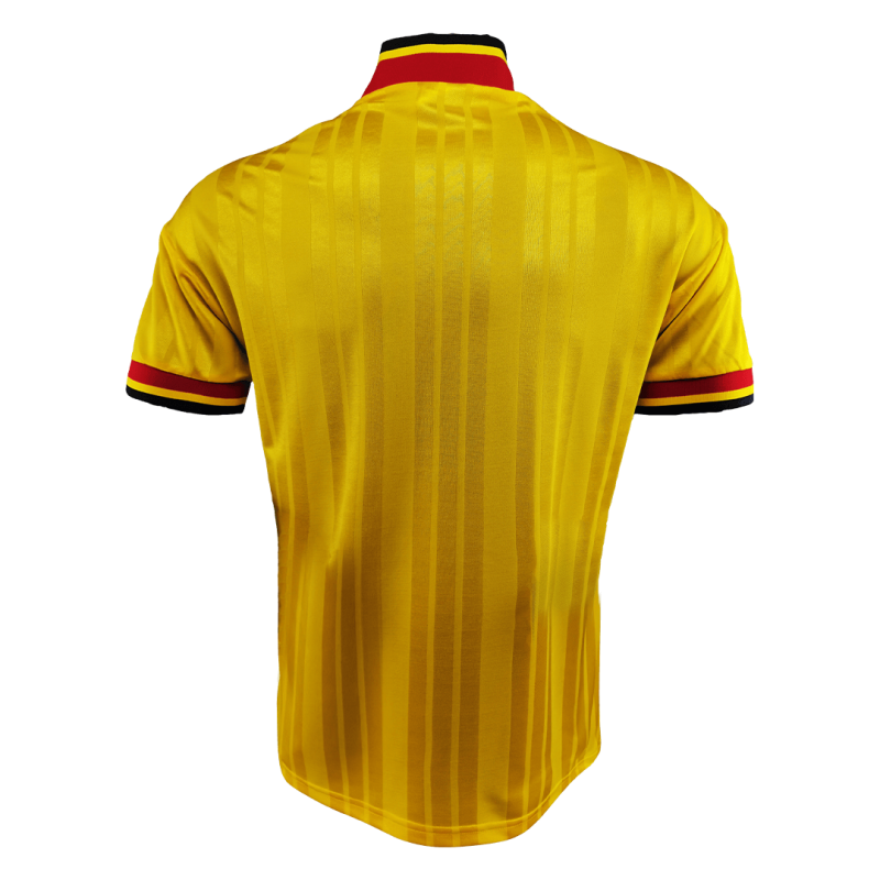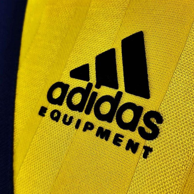 Staying true to the original, the Arsenal 1993-94 away shirt remake is yellow with a jacquard striping pattern and eye-catching Adidas stripes running diagonally across the front in dark blue.