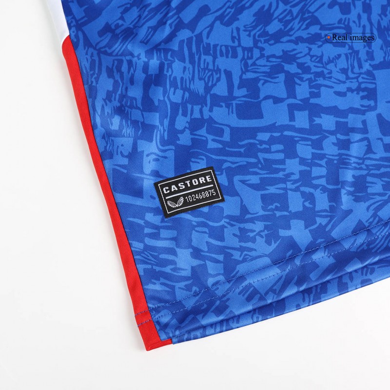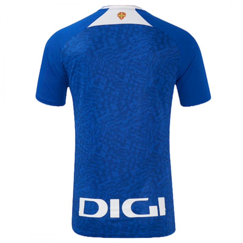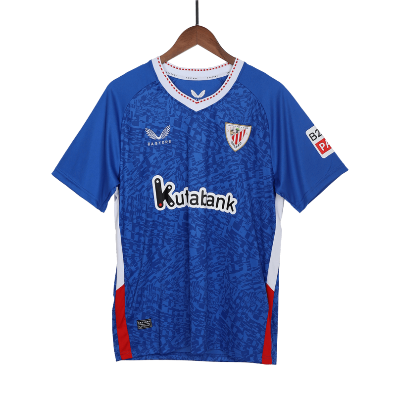 The Athletic Bilbao 24-25 away jersey has a royal blue ("Bilbao blue" - "Gabarra blue") main color combined with a grey collar with red trim.