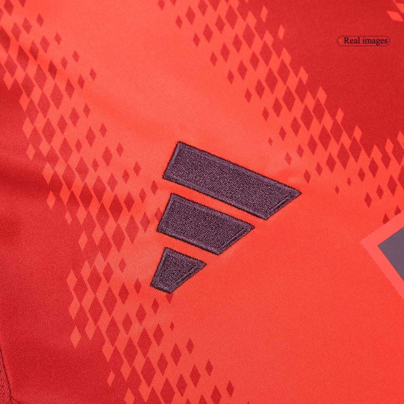 The Bayern Munich 2024-2025 home football jersey makes full use of the club's nickname, "Die Roten" (The reds), by having different shades of red only.