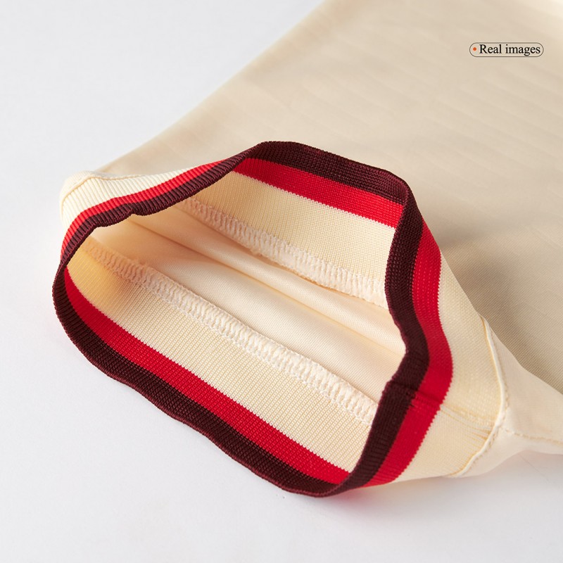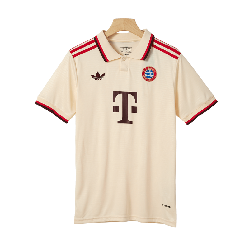The new Bayern München 2024-25 third football jersey is off-white (officially Linen) with dark red logos plus bright red trim.