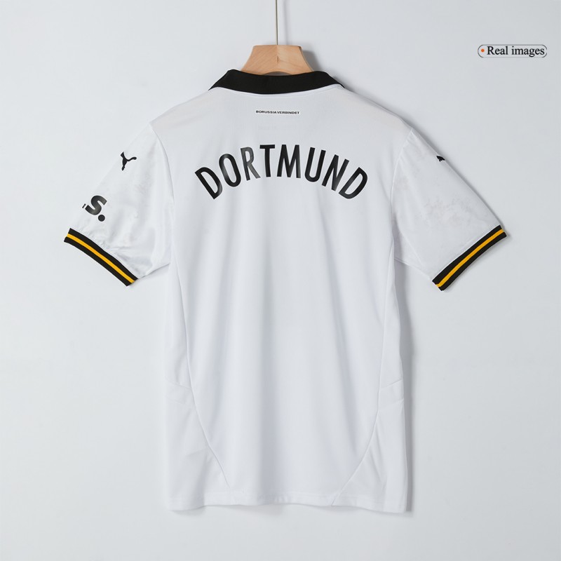 The Dortmund 24-25 third football shirt has a clean look with the main color white combined with black and yellow accents.