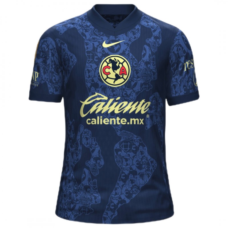 The Club América 2024-25 away jersey is predominantly 'Valerian Blue' with a map of the Americas graphic all over the shirt.