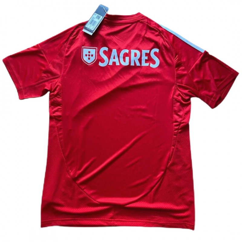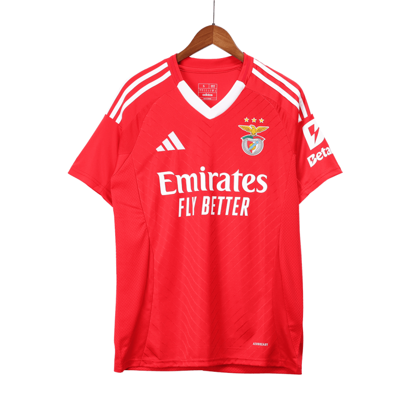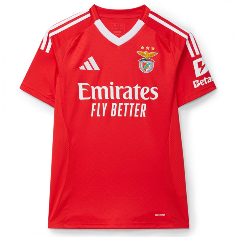 The Adidas SL Benfica 2024-2025 home football shirt has a V-shaped pattern imprinted on the front of the shirt to synchronize with the collar.