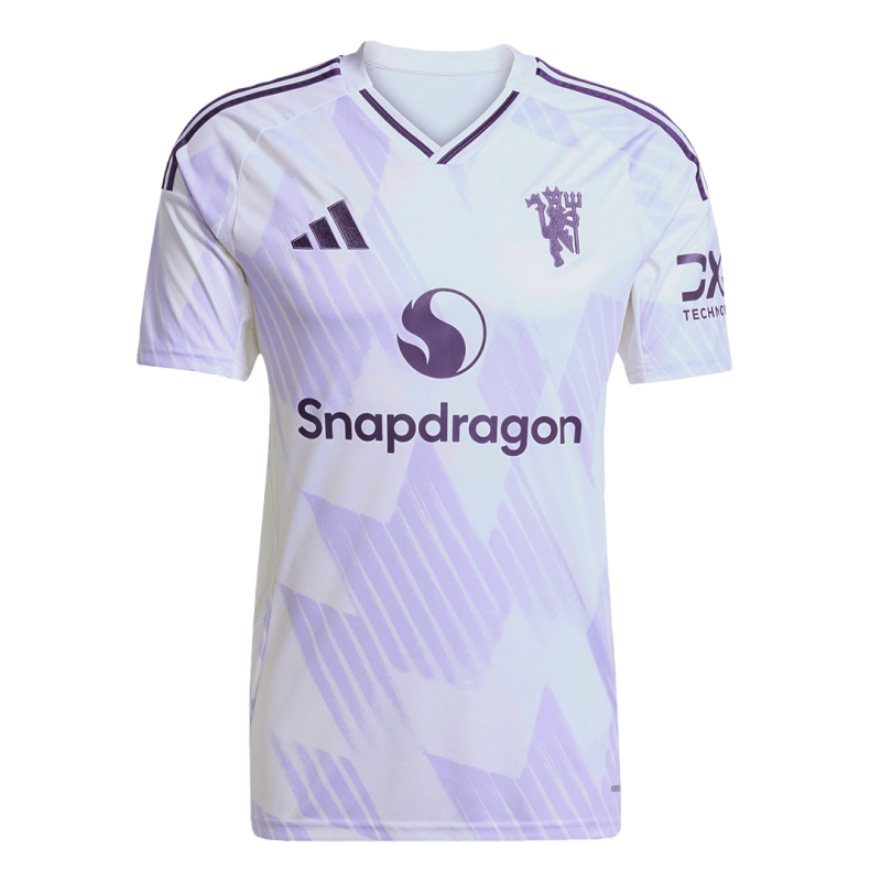The Adidas Manchester United FC 2025-2026 away shirt is white and light lavender, combined with dark purple accents (Dark Plum).