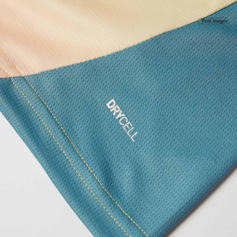 Manchester City's 2024-25 fourth kit combines a pale yellow base with navy-turquoise logos and teal applications.