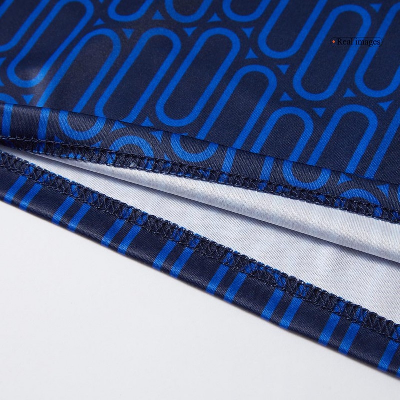 The front of the Al-Nassr 2024-2025 away jersey comes with a geometrical ellipse pattern in royal blue.