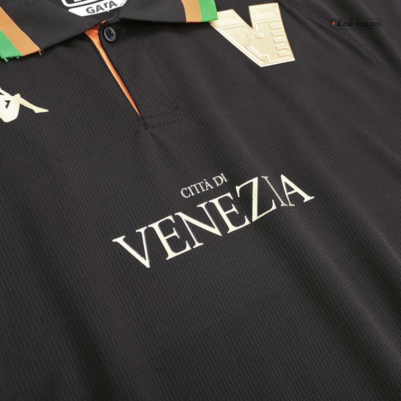 The Venezia 22-23 home jersey is black with orange and green trim on the collar and sleeves.