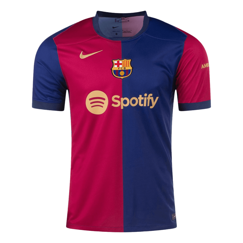 The Barcelona 2024-25 home jersey combines royal blue, navy, and red with gold logos.