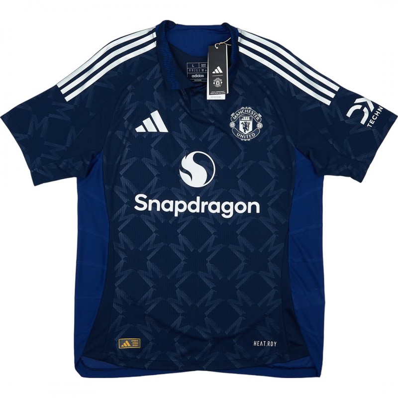 The new Manchester United FC 24-25 away football jersey features a navy blue main color ("Night Indigo") combined with light silver logos and red accents.