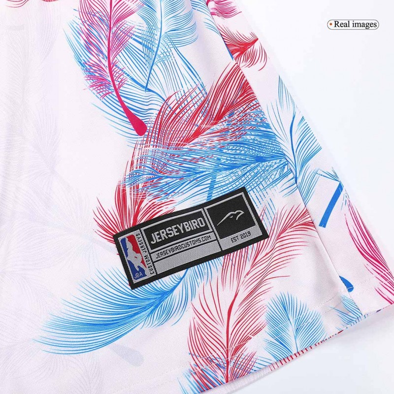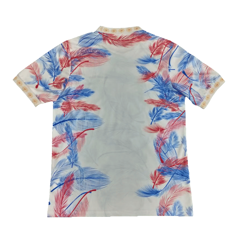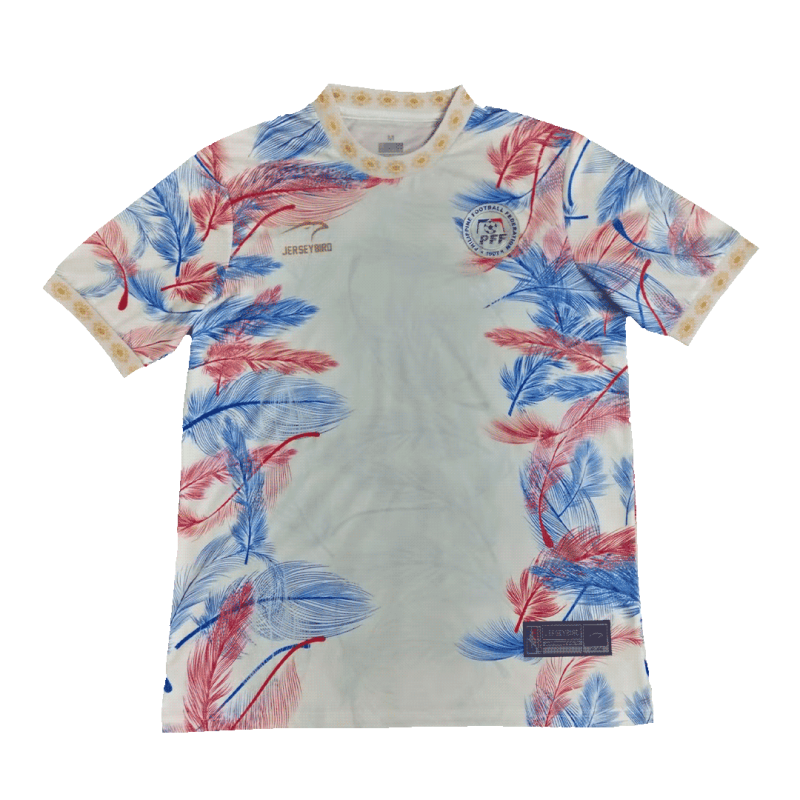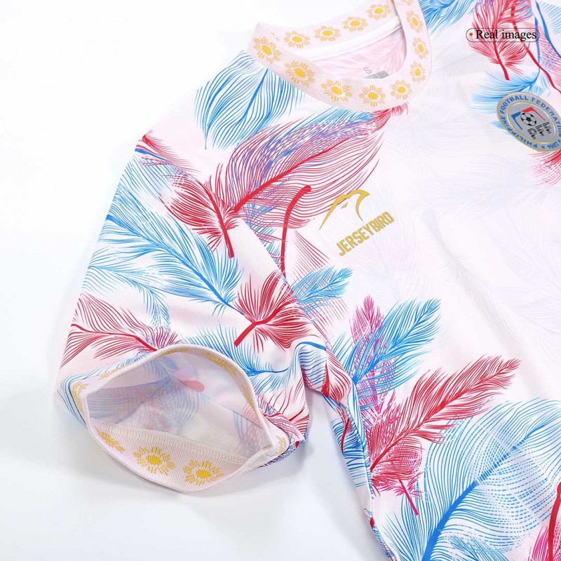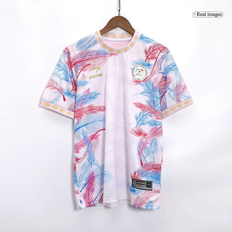 The JerseyBird Philippines 2023 home shirt combines a white base with gold logos and a unique feather graphic design.