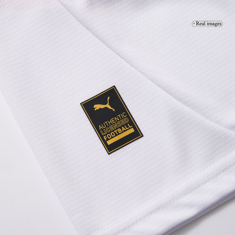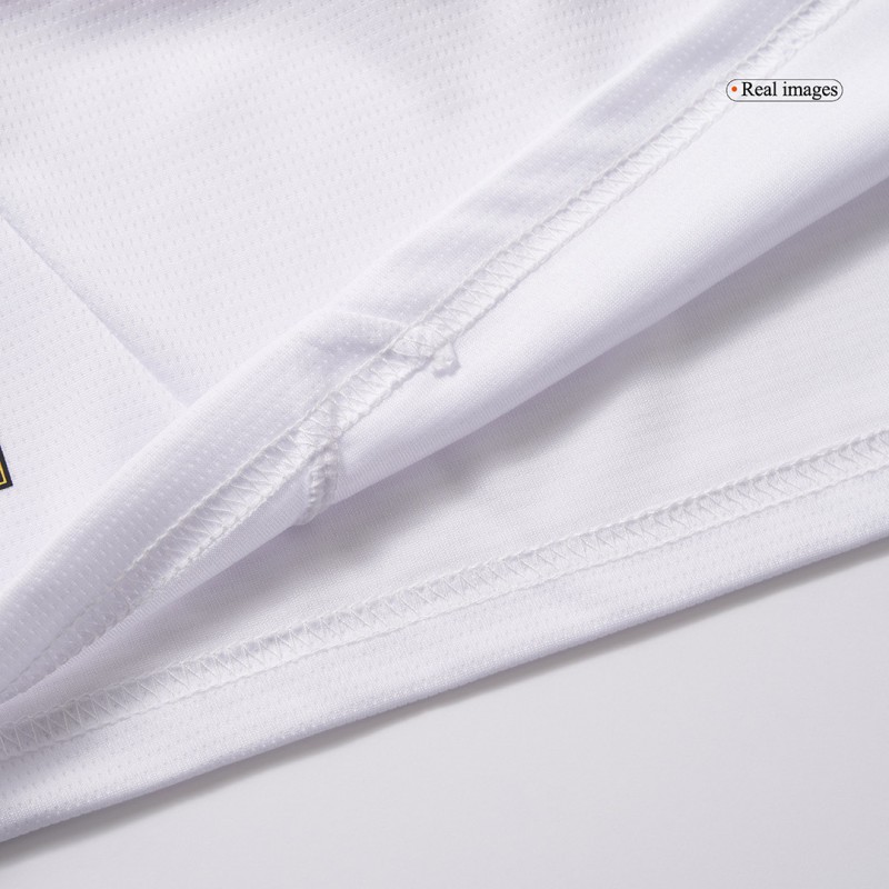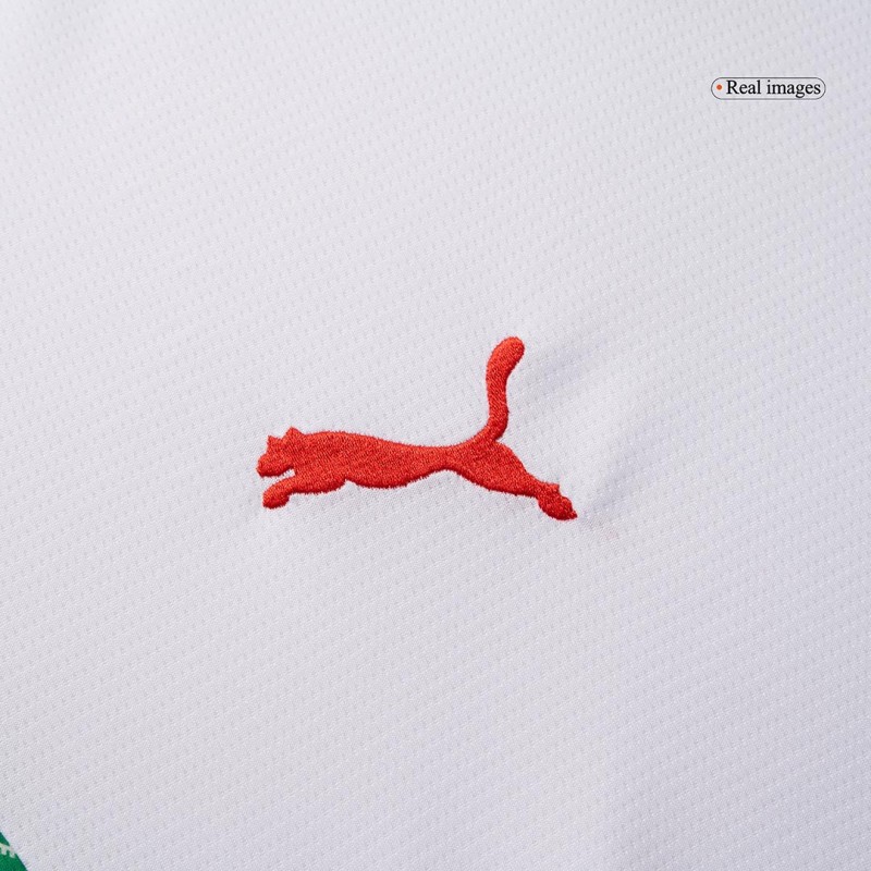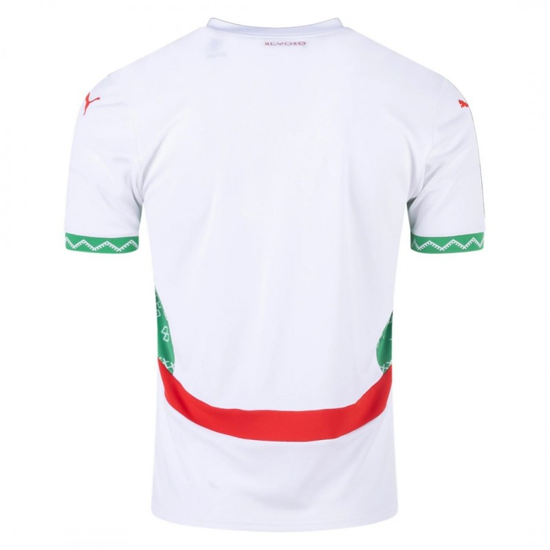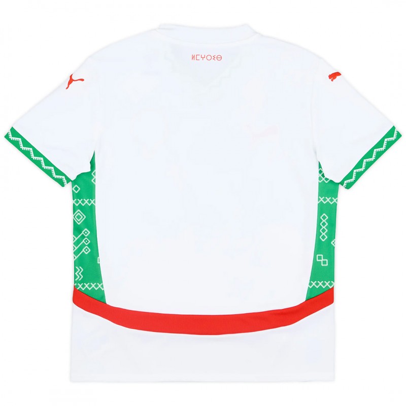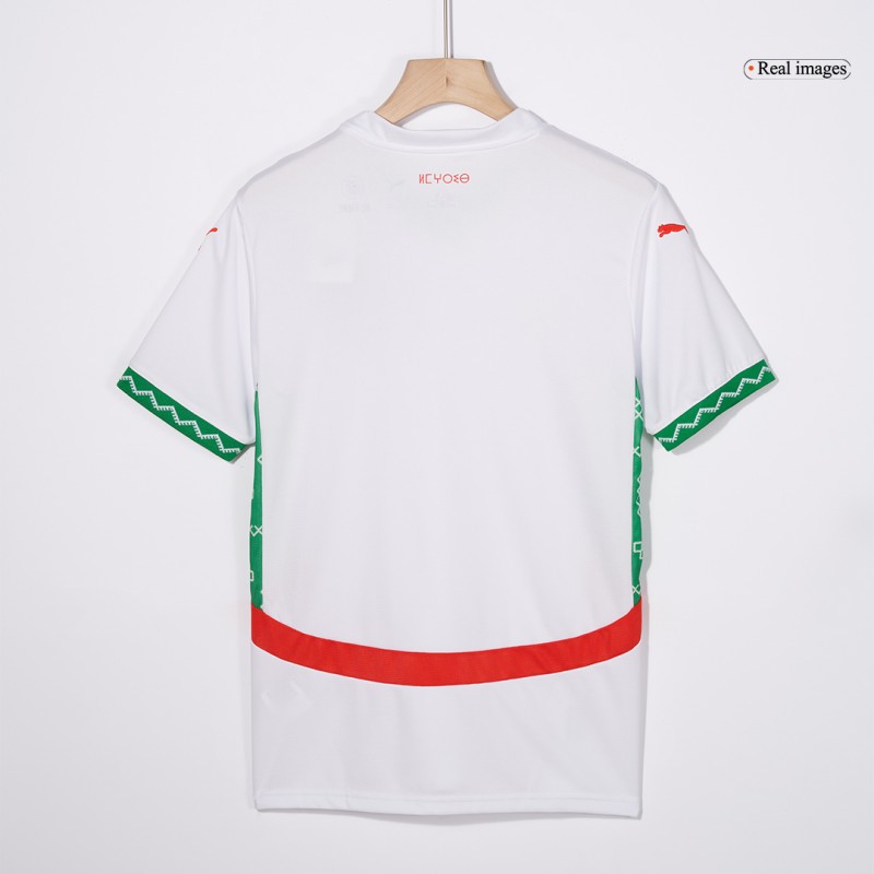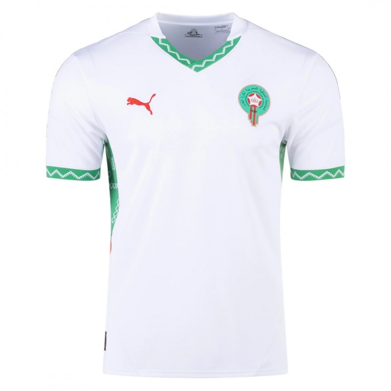 The Morocco 2024 away football shirt is predominantly white with green and red detailing.