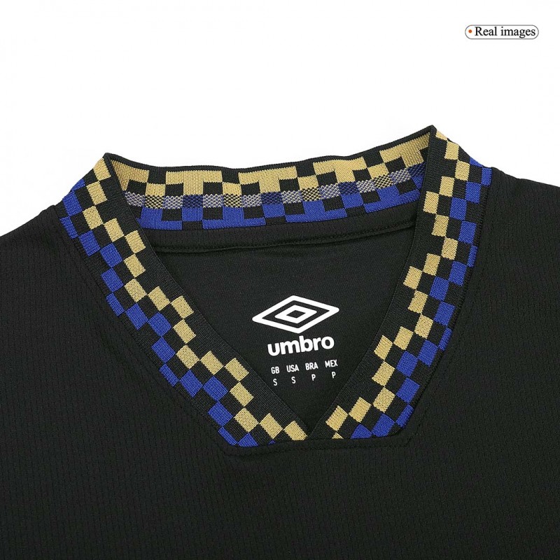 The Umbro El Salvador 2023-24 third shirt has a stylish design in black, combined with clever yellow and blue detailing for the collar and the sleeve cuffs.