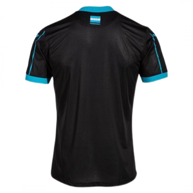 More turquoise / sky blue features on the Joma Honduras 2023 away football shirt, which is black with pinstripes and monochrome logos and accents.