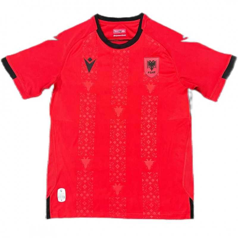 The Albania 24-25 home shirt is traditionally red with a crew neck and sleeve cuffs in black.