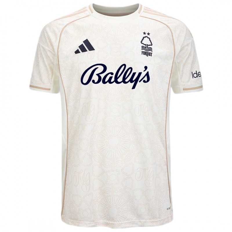The Nottingham Forest 2025-2026 away kit takes a different approach, drawing inspiration from Nottingham's renowned lace industry.