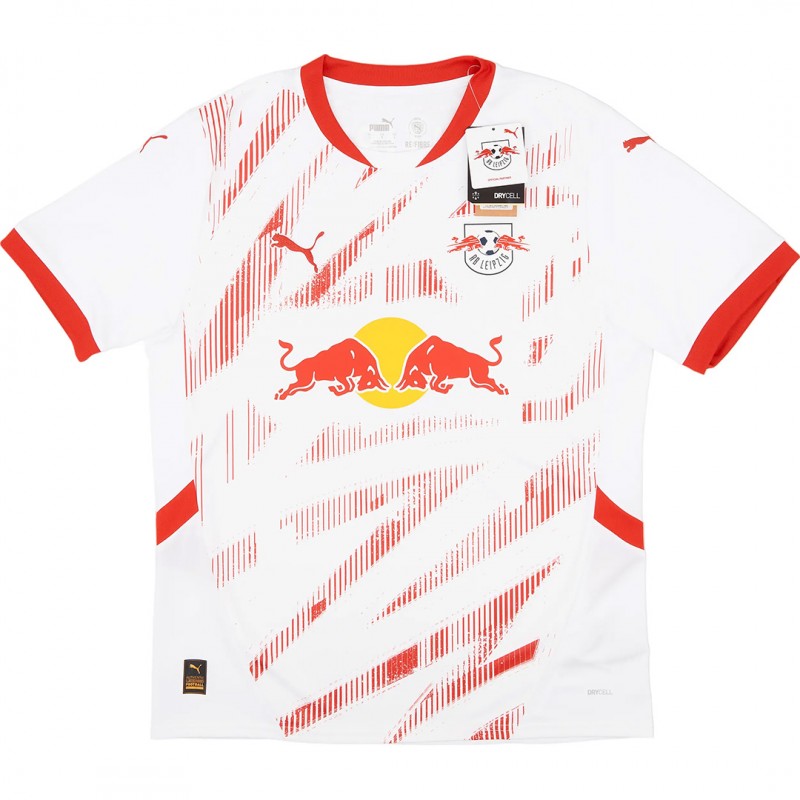 The RB Leipzig 2024-2025 home jersey has a modern design in the club's white and red colors.