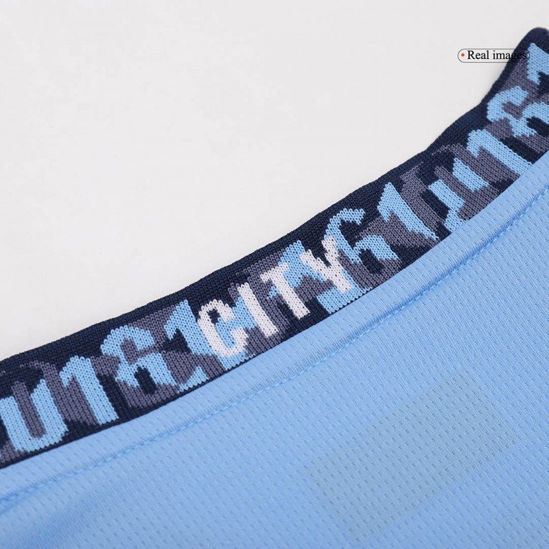 The new Man City 2024-25 home jersey has the classic sky blue color combined with navy applications and white logos.
