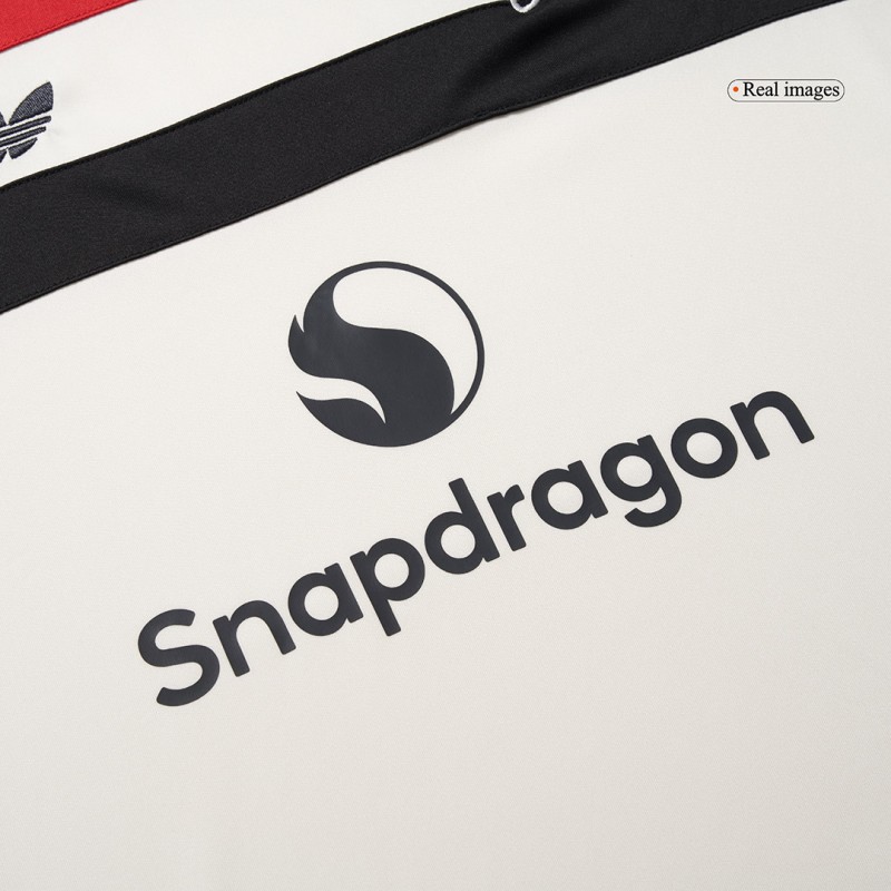 The standout feature of the Manchester United 24-25 third kit is a tricolor stripe on the chest in red, off-white, and carbon.
