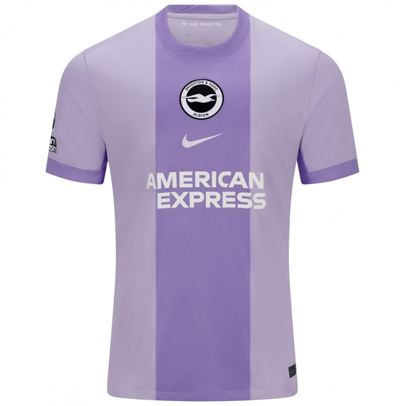 The Nike Brighton & Hove Albion 2025-2026 away shirt debuts a fresh look with a dual-tone purple color scheme, the first time this palette has been used in the Seagulls' kit range.