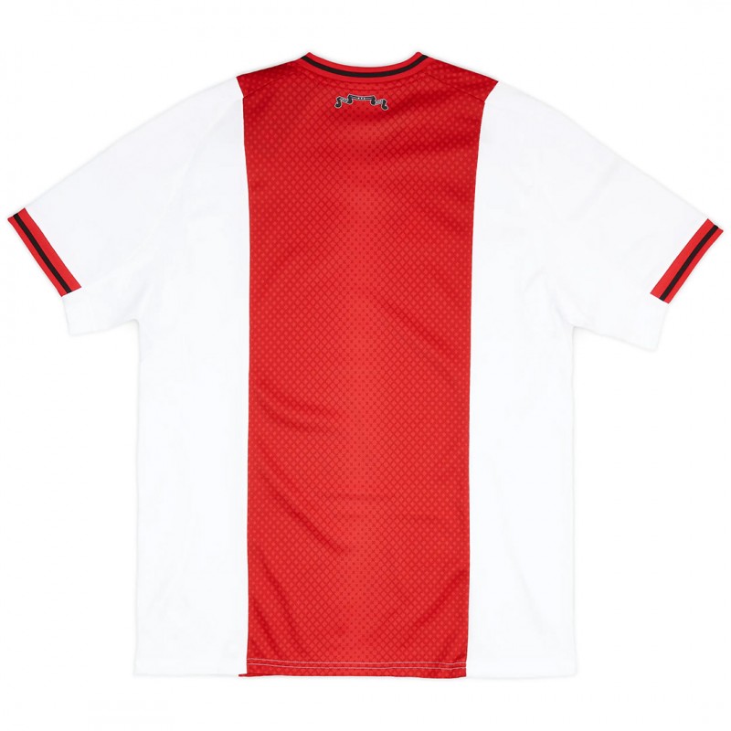 The Adidas AFC Ajax 2025-2026 home football shirt proudly features the club's iconic traditional white base with a broad central red stripe.