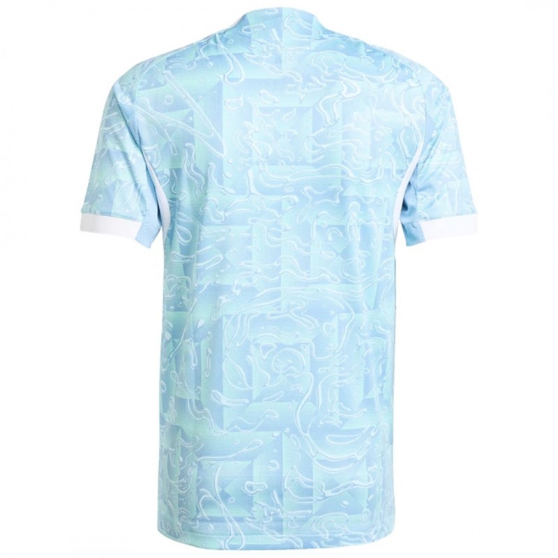 The Adidas Juve 2025-2026 away football shirt is predominantly light blue, with white logos and light citrus yellow details.