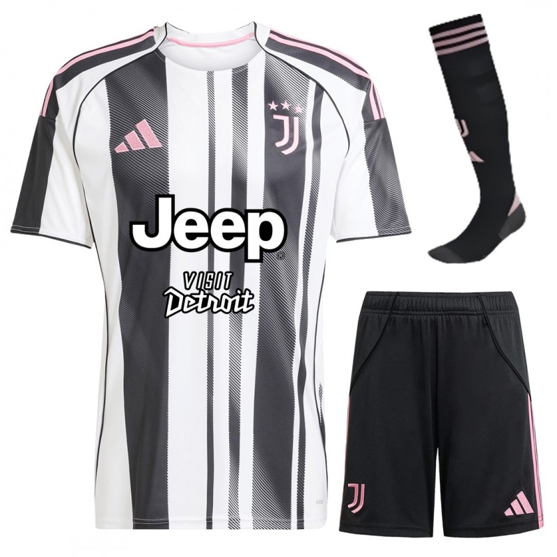 The Adidas Juventus 2025-26 home shirt combines the club's classic white and black with pink logos and piping, a first in the team's history.