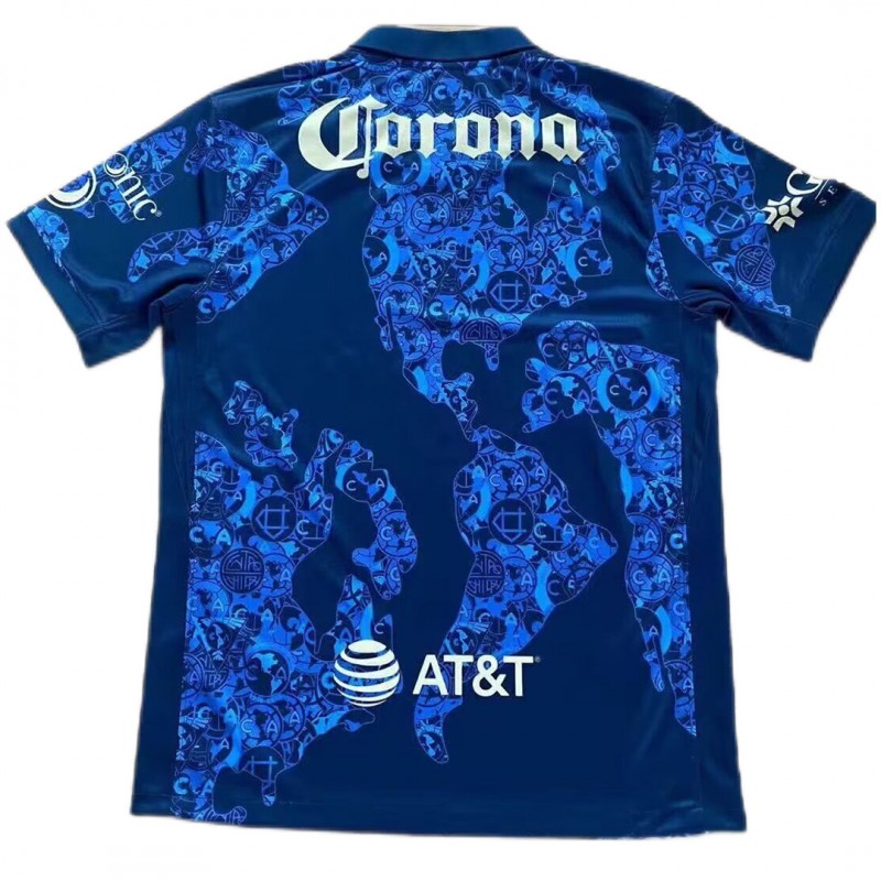 The Club América 2024-25 away jersey is predominantly 'Valerian Blue' with a map of the Americas graphic all over the shirt.