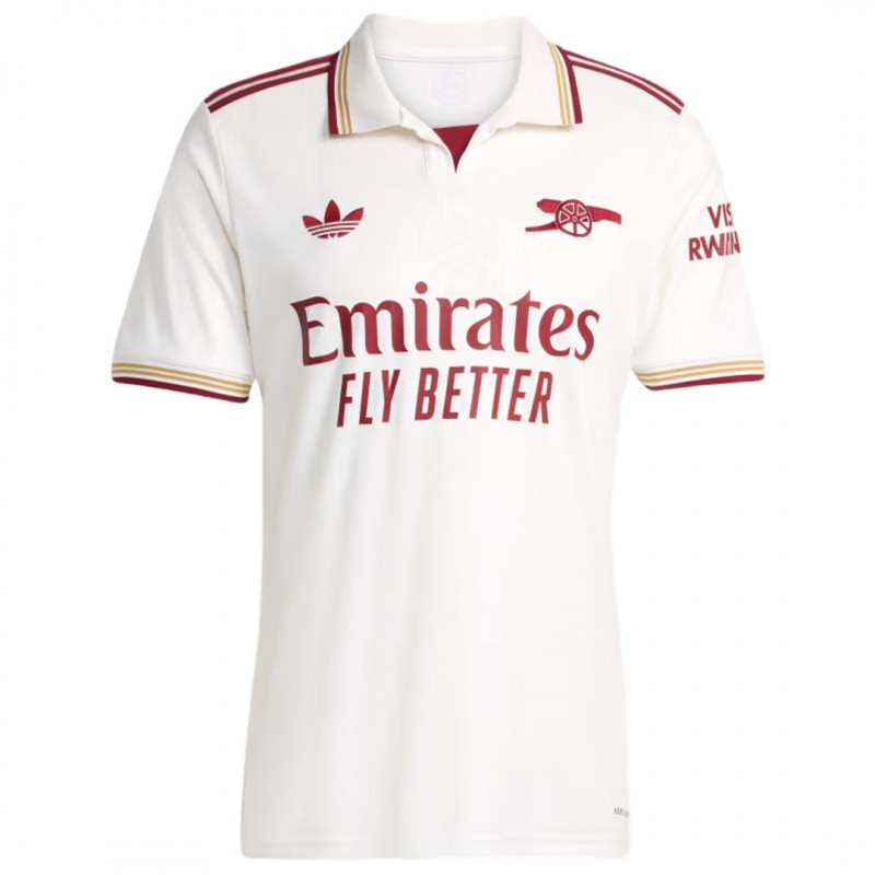 The Adidas Arsenal 2025-26 third shirt brings back the colors of the 2007-09 alternative kit by Nike - a white base is combined with maroon logos plus maroon & gold detailing.