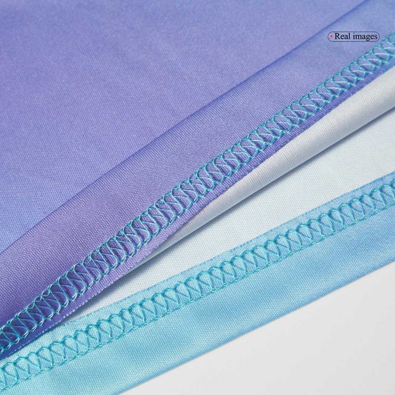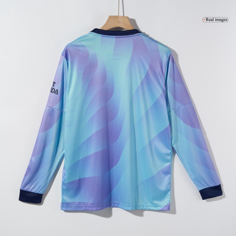 The Arsenal 24-25 third football shirt has an aqua main color combined with Light Purple and Navy Blue.