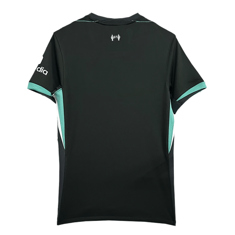 The Liverpool 2024-2025 away jersey combines a dark anthracite base (almost black) with light turquoise and lighter anthracite applications.