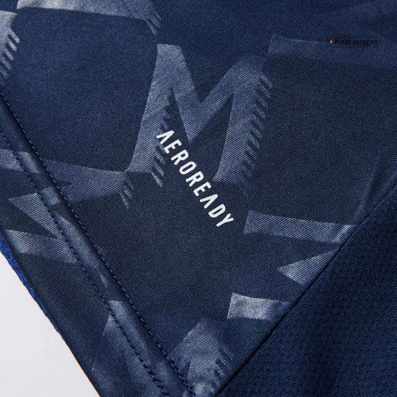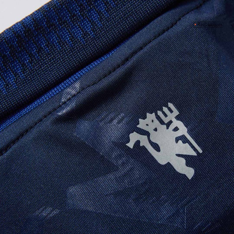 The new Manchester United FC 24-25 away football jersey features a navy blue main color ("Night Indigo") combined with light silver logos and red accents.