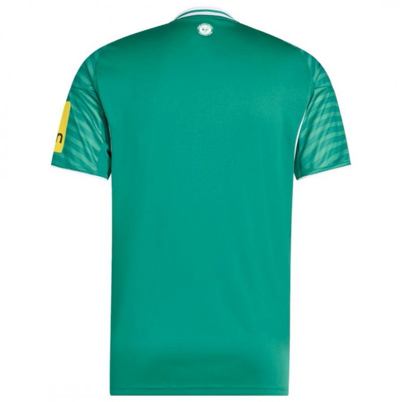Rounding off the Newcastle United 25-26 away kit is a subtly darker green horizontal striping across the body, plus white accents, including the V-neck collar trim, Adidas logo, Newcastle United crest (which appears in white instead of its usual colors), and the "sela" sponsor logo across the chest.