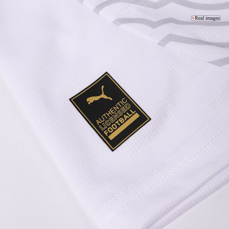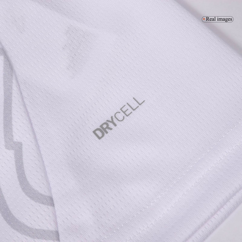 The new Al-Hilal 2024-25 away football shirt is white with a pattern of thin lines radiating across the front of the shirt.
