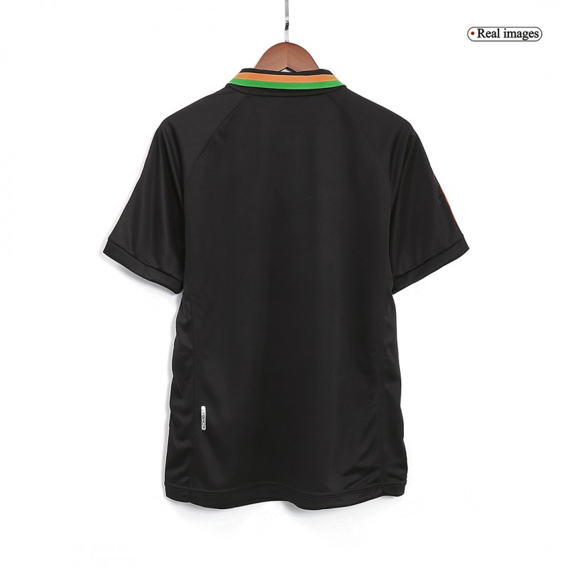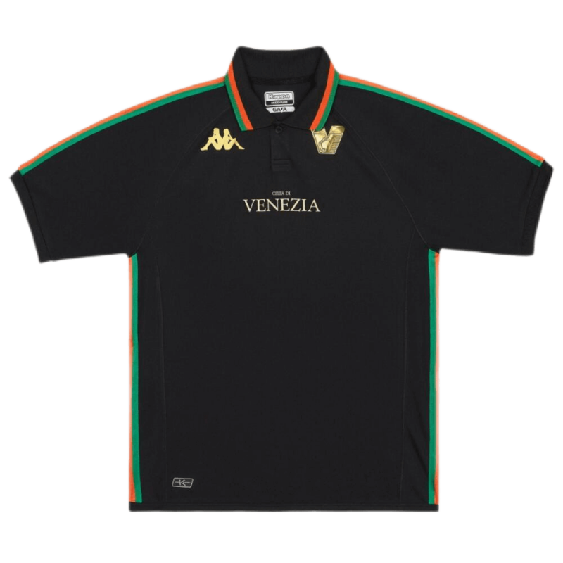 The Venezia 22-23 home jersey is black with orange and green trim on the collar and sleeves.