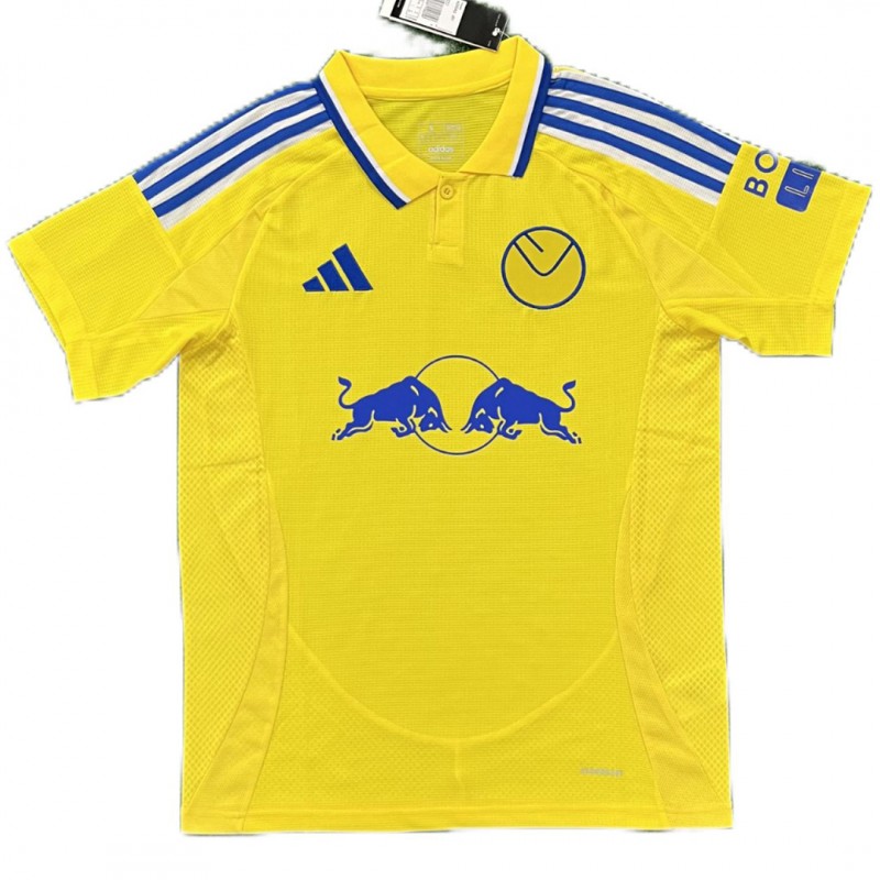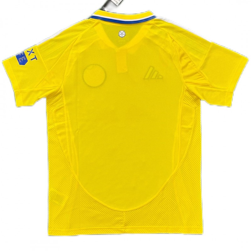 The Leeds United FC 2024-25 away jersey is "EQT Yellow", combined with blue for logos.