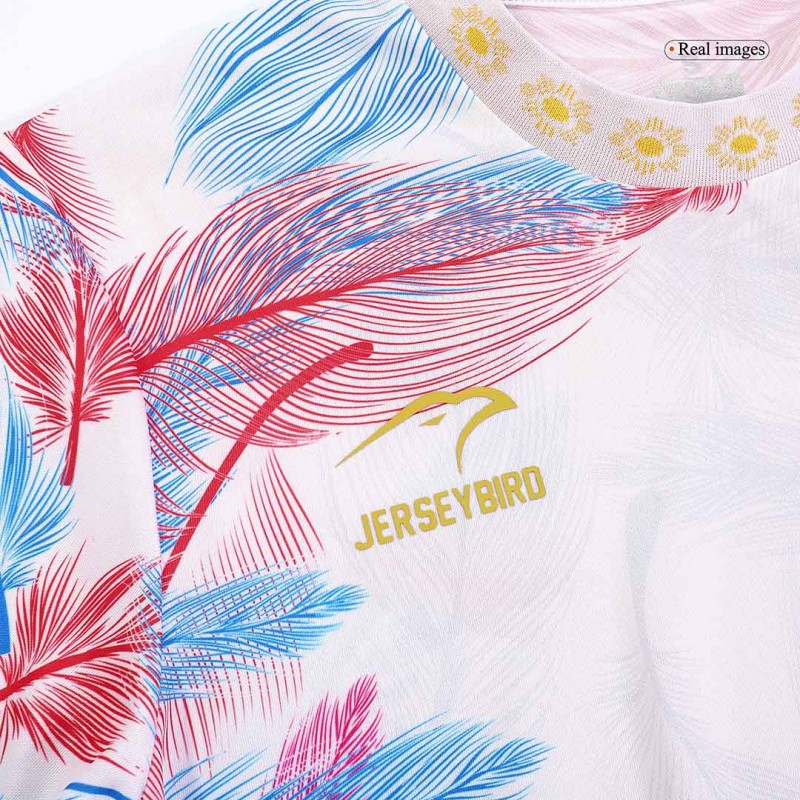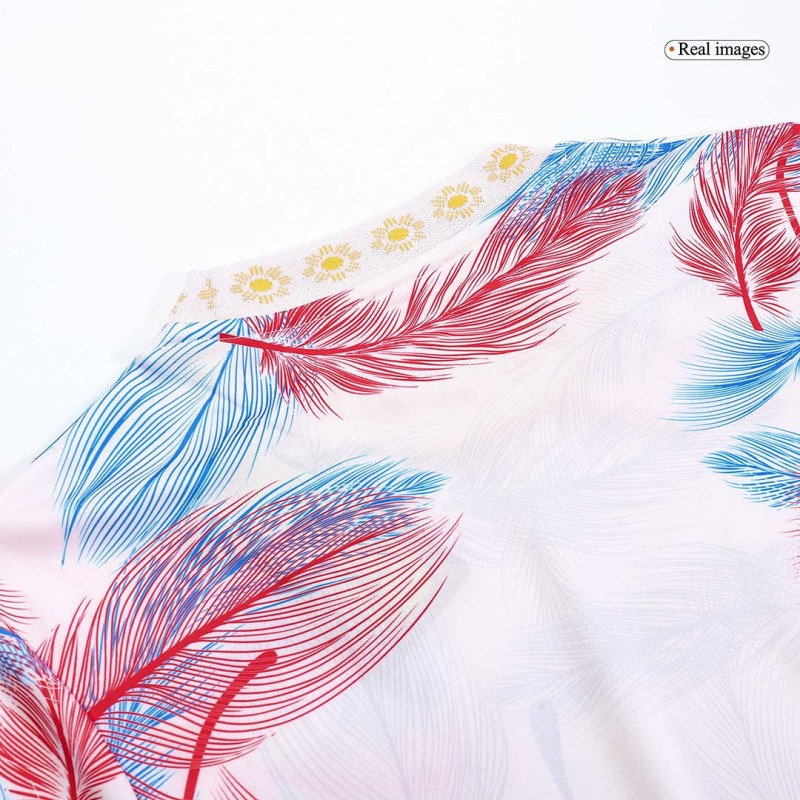 The JerseyBird Philippines 2023 home shirt combines a white base with gold logos and a unique feather graphic design.