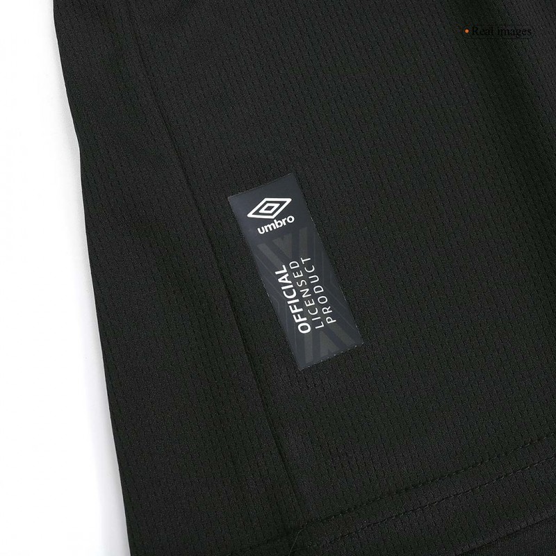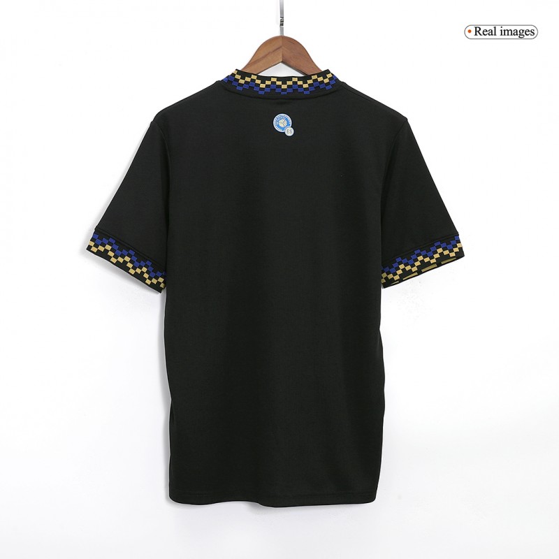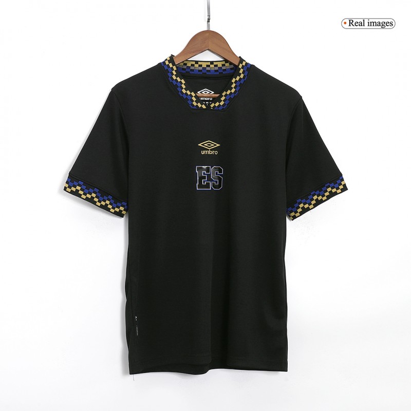 The Umbro El Salvador 2023-24 third shirt has a stylish design in black, combined with clever yellow and blue detailing for the collar and the sleeve cuffs.