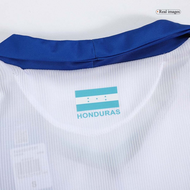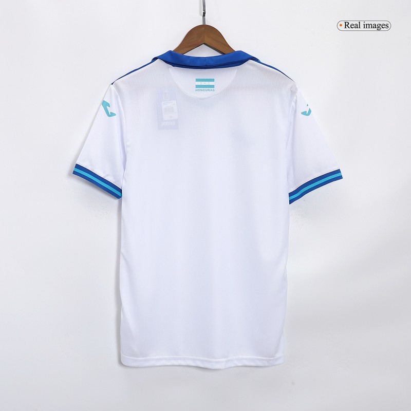 The Joma Honduras 2023 home shirt is predominantly white with turquoise added as a secondary accent color in addition to the usual blue.