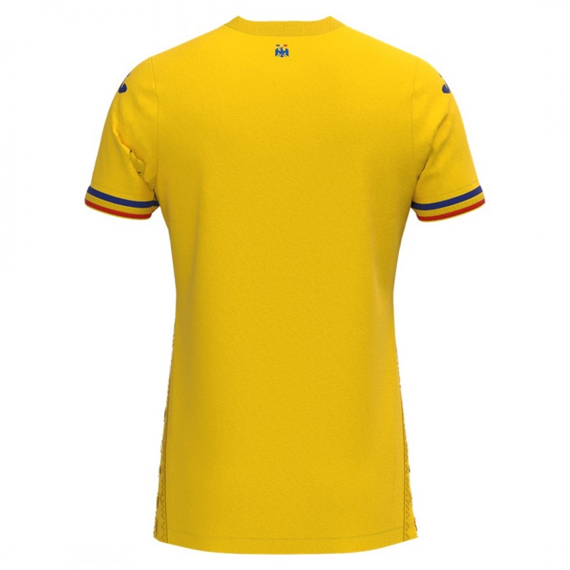 The Joma Romania 2023 home shirt is in the main yellow color without much combination apart from the blue and red for the manufacturer logos and sleeve cuff details.