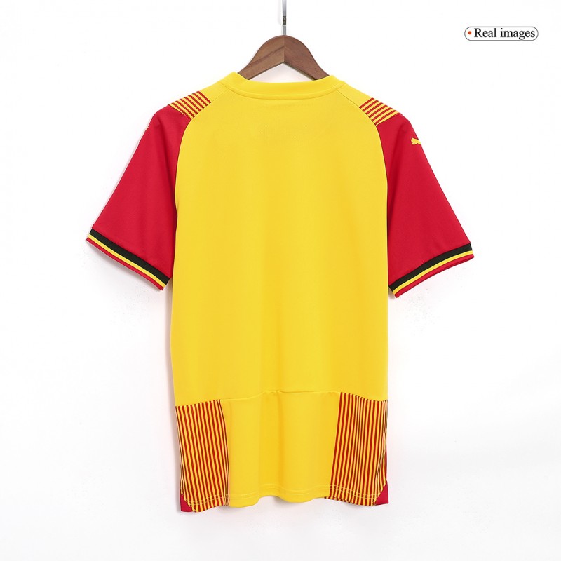 Notable details include a black collar and black, red, and yellow piping on the sleeves of the Puma RC Lens 2023-2024 home jersey.