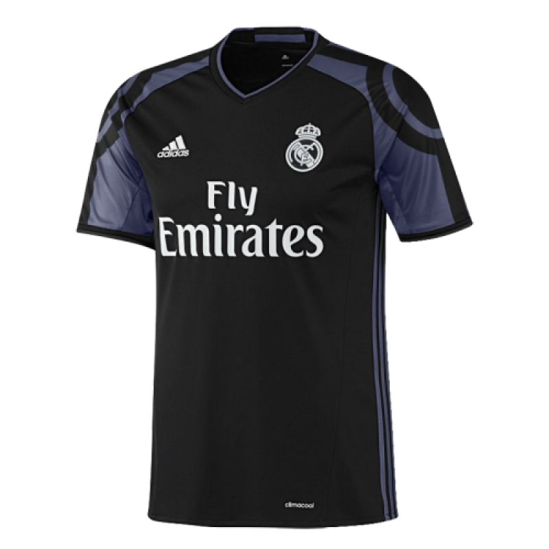 The new Real Madrid 2016-17 third shirt is mostly black, with white club and sponsor logos and dark pale purple Adidas stripes running down on both sides.